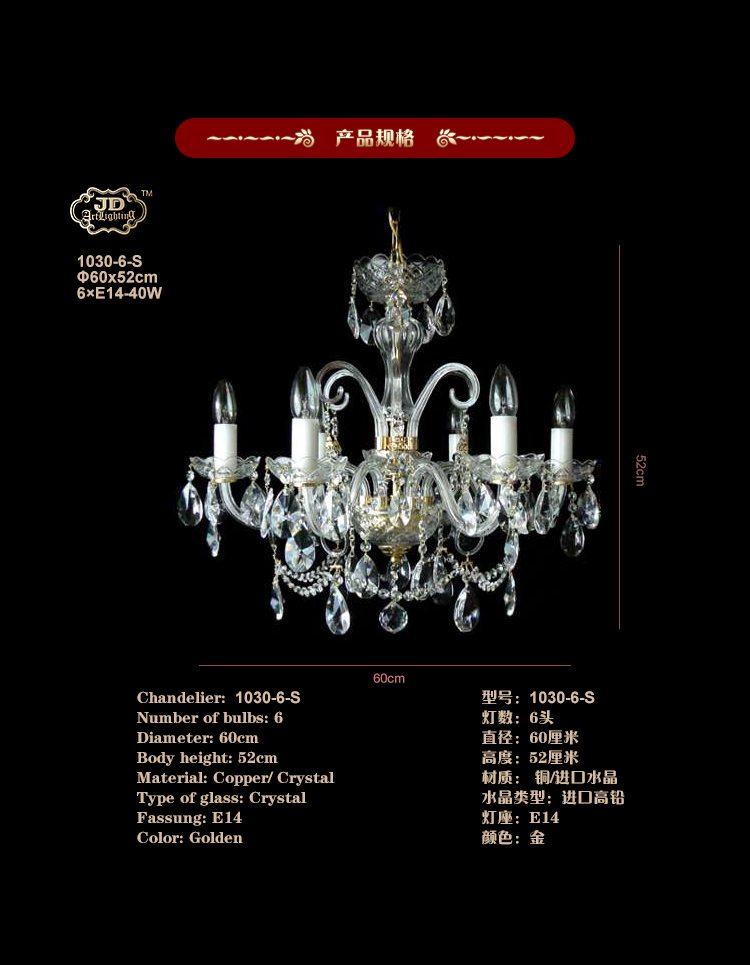 直径:60CM,高度:52CM,原价:6299,现价:5039。灯具整体较小,无论是卧室、厨房、餐厅、阳台、玄关等小空间皆能安放,风格偏欧式,采用透明水晶搭配镀金铜质灯身